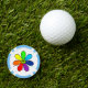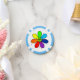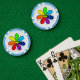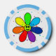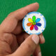 A smiling flower with seven spotted rainbow petals and a colourful polka dot background.