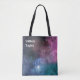 This etherial galaxy tote bag is perfect for a modern, whimsical woman. The design features a colourful cosmic background with stars and modern typography for an "out of this world" look.