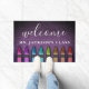 Deep purple faux glitter background compliments the rainbow coloured crayons in hot pink, purple, blue, turquoise, green, gold, orange, and red. Bold white text reads "welcome" in chalkboard or calligraphy font. Easily update the teacher's name or classroom title. Available in many other sparkly background colours and designs.