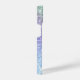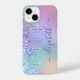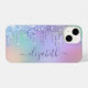 Custom elegant and girly iPhone case featuring unicorn-coloured rainbow dripping faux glitter on a purple, pink, blue, green and orange background. Personalise with your name in a stylish trendy purple script with swashes.