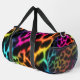 This image displays a duffel bag featuring a captivating leopard print design where the spots appear to be outlined with a vibrant, glowing rainbow effect. The "fur" within the spots transitions smoothly through a spectrum of colours including blue, green, yellow, orange, pink, and purple, creating a striking contrast against the dark, possibly black, background. The bag has black carrying straps. This unique and eye-catching design gives the duffel bag a dynamic and playful look, perfect for adding a pop of colour and personality to any outing.