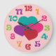 This fun design features clock numbers in a rainbow of colours, and four hearts in teal, purple, pink and red colours. To personalise the clock, click on the Customise It button. This clock works makes a great décor item for a girls room.