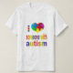 Tshirt with rainbow design on words "I (heart image) someone with autism". The heart image has multi-coloured puzzle pieces on the inside.