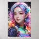 A young woman with multicolored pastel hair and vibrant eyes is depicted against a dark background speckled with light, emulating a starry sky. She wears a leather jacket that reflects a rainbow of colours and has accessories including a hair clip, a fluffy blue hair tie, and dangling earrings.