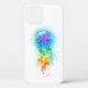Large, iridescent, artistically drawn, bright jellyfish, with long tentacles on white, painted over with multicolored watercolor background. Rainbow jellyfish.