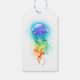 Large, iridescent, artistically drawn, bright jellyfish, with long tentacles on white, painted over with multicolored watercolor background. Rainbow jellyfish.