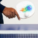 Large, iridescent, artistically drawn, bright jellyfish, with long tentacles on white, painted over with multicolored watercolor background. Rainbow jellyfish.