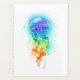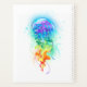 Large, iridescent, artistically drawn, bright jellyfish, with long tentacles on white, painted over with multicolored watercolor background. Rainbow jellyfish.