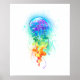 Large, iridescent, artistically drawn, bright jellyfish, with long tentacles on white, painted over with multicolored watercolor background. Rainbow jellyfish.