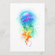 Large, iridescent, artistically drawn, bright jellyfish, with long tentacles on white, painted over with multicolored watercolor background. Rainbow jellyfish.