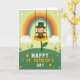 Designed with a cheerful St. Patrick’s Day scene, the card features a smiling leprechaun in a green top hat swinging from two brown ropes on the wide petals of a huge golden flower. He hugs a pot spilling with gold coins, and his bright grin gives the moment a friendly, inviting feel 💚. A soft rainbow arcs across a pale green sky behind him, adding a gentle glow to the background 🌈. Two fluffy white clouds float on either side, balancing the scene and framing the leprechaun like quiet companions. Below, rolling green hills stretch across the foreground with small yellow flowers and a few simple sprigs of foliage. The message “HAPPY ST. PATRICK’S DAY” sits prominently in the design in friendly, thick lettering, standing out clearly against the light sky. Tiny white specks, like little blossoms or stars, are scattered near the top of the card.