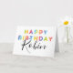 This clean and simple style greeting card is perfect for sending some bright and colourful birthday cheer. The front of this card reads "Happy Birthday" in rainbow coloured letters with your recipient's name in bold black script lettering. Matching black script spells out your custom greeting on the inside of this card.