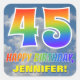 This exciting, fun, and eye-catching birthday-themed sticker design features a cloudy blue sky pattern background, a large number "45" and "HAPPY BIRTHDAY," both having a multicolored rainbow spectrum inspired gradient pattern, and a personalised name. Fun and colourful stickers like this might be used when wrapping gifts being given to somebody who is celebrating their forty fifth birthday. [~Z0000374]