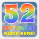 This eye-catching, vibrant, and exciting birthday-themed sticker design features a blue sky with clouds pattern background, a large number "52" and "HAPPY BIRTHDAY," both having a multicolored rainbow spectrum inspired gradient pattern, and an editable name. Fun and colourful stickers like this might be used when wrapping gifts being given to somebody who is celebrating their fifty second birthday. [~Z0000374]