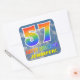 This exciting, fun, and eye-catching birthday-themed sticker design features a cloudy blue sky pattern background, a large number "57" and "HAPPY BIRTHDAY," both having a multicolored rainbow spectrum inspired gradient pattern, and an editable name. Fun and colourful stickers like this might be given as a gift to somebody who is celebrating their 57th birthday. [~Z0000374]