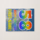 This fun, exciting, and vibrant birthday themed puzzle design features a blue sky with clouds pattern background, a large number "58" and "HAPPY BIRTHDAY," both having a multicolored rainbow spectrum inspired gradient pattern, and a custom name. A caring, happy, and personalized birthday puzzle like this might be a fun way to send birthday wishes to somebody who is celebrating their fifty eighth birthday. [~Z0000375]