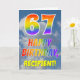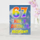 This fun and colourful 67th birthday greeting card design features a representation of a cloudy blue sky, along with a large number "67" and the message "HAPPY BIRTHDAY," having a rainbow spectrum inspired gradient pattern colouring, on the front. The front also features the custom name of the card’s recipient. The inside features an editable birthday greeting message, or could perhaps be cleared and left blank if a message is to be written by hand instead. A customisable birthday card like this might be a fun way to send a message in celebration of somebody’s sixty seventh birthday. [~Z0000371]