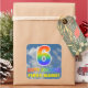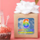 This exciting, fun, and eye-catching birthday-themed sticker design features a blue sky with clouds pattern background, a large number "6" and "HAPPY BIRTHDAY," both having a multicolored rainbow spectrum inspired gradient pattern, and a custom name. Fun and colourful stickers like this might be used when wrapping presents being given to somebody who is celebrating their 6th birthday. [~Z0000374]