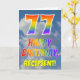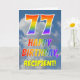 This fun and colorful 77th birthday greeting card design features a representation of a clouded blue sky, along with a large number "77" and the message "HAPPY BIRTHDAY," having a rainbow spectrum inspired gradient pattern coloring, on the front. The front also features the customizable name of the card’s recipient. The inside features a customizable birthday greeting message, or could perhaps be cleared and left blank if a message is to be written by hand instead. A birthday card like this might be a fun way to send birthday wishes to somebody who is celebrating their seventy seventh birthday. [~Z0000371]