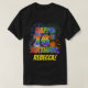 The front of this fun, vibrant and exciting birthday-themed shirt design features a colourful pattern inspired by celebratory fireworks, along with the message "HAPPY 76TH BIRTHDAY" having a multicolored rainbow inspired gradient pattern, and a customisable name coloured yellow. A fun, happy shirt like this might be worn by the guests at a birthday party being held in celebration of somebody’s seventy sixth birthday. [~Z0000356]