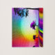 Who knows where this rainbow coloured pathway will lead? A distant, faded city is seen in the background passed purple and silhouette trees.
