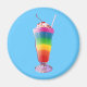 A kitchy, retro image of a milkshake with rainbow stripes.