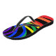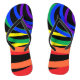These colourful flip flops feature an abstract three dimensional pattern of rainbow crescent moons in colours of red, orange, yellow, green, blue and purple on a black background.