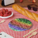 Bright and colourful rainbow gradient mosaic. Great background to customise with text or keep as decorative pattern.