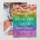Save the date card for a gay wedding with a rainbow ombre background and pretty fairy lights. Add your names in a charming script and a photo on the back.