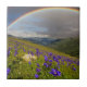 This photo features a rainbow over a field of bluebonnet wildflowers in the shadow of a mountain range.