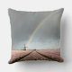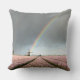 Photo throw pillow cushion with a rainbow and dark clouds during a spring storm over a landscape with an old windmill and pink hyacinth flowers in the dutch Bulb Region in the Netherlands.