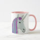 This is a beautiful unique unicorn coffee mug. It is white on the exterior and has a large unicorn head with pretty pastel rainbow colour hair on both sides of the mug. The inside of mug is solid cotton candy pink and you may change the colour if you'd like.
