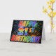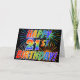 The front of this eye-catching, vibrant and fun greeting card design features a colourful pattern inspired by celebratory fireworks, along with the message "HAPPY 21ST BIRTHDAY!" having a multicolored rainbow like gradient pattern, on a black coloured background. The inside features a personalised greeting message, or could perhaps be cleared and left blank if a message is to be written by hand instead. A greeting card like this might be a fun, happy way to acknowledge somebody’s twenty first birthday. [~Z0000355]