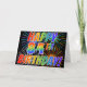 The front of this fun, vibrant and eye-catching greeting card design features a colorful celebratory fireworks inspired pattern, along with the message "HAPPY 84TH BIRTHDAY!" having a multicolored rainbow inspired gradient pattern, on a black colored background. The inside features a custom greeting message, or could perhaps be cleared and left blank if it is desired to write a message by hand instead. A greeting card like this might be a fun, happy way of sending a greeting message to somebody who is celebrating their eighty fourth birthday. [~Z0000355]