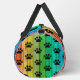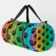 This playful Gear bag features an eye-catching design of black paw prints layered over a vibrant rainbow spectrum, resembling colourful wooden planks. It's a fun Kit bag and an ideal Weekender for animal lovers' adventures.