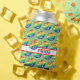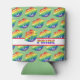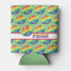 A pattern of lips with rainbow colours. On the bottom of this design there's a white banner, with red trim. Inside the banner is the PRIDE, in rainbow colours. You can customise this can cooler by changing the background colour.