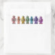 A row of seven retro-styled robots is presented, each one painted in a distinct colour ranging from red to purple. The robots feature mechanical details such as dials, buttons, and antennae, giving them a vintage, playful appearance.