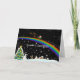Christmas scene with Christmas tree, snowman, and houses in the background, and Santa flying over the rainbow towards the night sky. Unique and beautiful illustrations for Christmas cards.