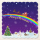 Beautiful snowscape on Christmas night with Christmas trees, houses, a snowman, a church, and Santa Claus flying over a rainbow in the night sky with snowflakes.
