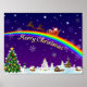 Beautiful snowscape on Christmas night with Christmas trees, houses, a snowman, a church, and Santa Claus flying over a rainbow in the night sky with snowflakes.