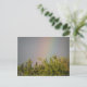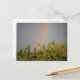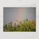 This postcard features a beautiful landscape photo of a rainbow over the top of some trees. The photograph was taken immediately after a rainstorm to capture the vivid colours of the rainbow. The surrounding sky is grey with cloud cover.