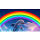 A playful dolphin leaping from bright blue waves with a bold rainbow arcing behind it. A cheerful, colourful illustration full of motion and joy.