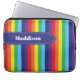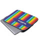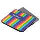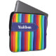 This bright rainbow striped pattern laptop sleeve has an indigo blue banner ribbon with white stitching detail across the top. It is personalised with a name or whatever text you want to add.