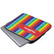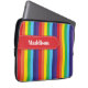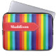 This bright rainbow striped pattern laptop sleeve has a red banner ribbon with white stitching detail across the top. It is personalised with a name or whatever text you want to add.