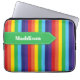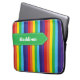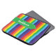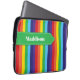 This bright rainbow striped pattern laptop sleeve has a green banner ribbon with white stitching detail across the top. It is personalised with a name or whatever text you want to add.