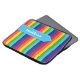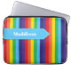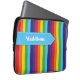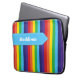 This bright rainbow striped pattern laptop sleeve has a light blue banner ribbon with white stitching detail across the top. It is personalised with a name or whatever text you want to add.