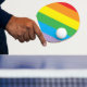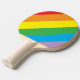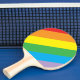 This bight, colourful ping pong paddle has eye catching rainbow stripes on it.