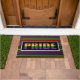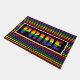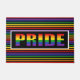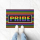 This colourful doormat features a bright rainbow striped background against black. The centre has a black rectangle with the word 'PRIDE' in a colourful rainbow design.