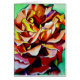from original watercolour art painting design by artist Sacha Grossel of mulit coloured "Alpine Sunset" rose flower in macro close up focus. The orange, yellow and brown highlights of this beautiful rose and colourful, bright effects of the floral design against a cool, green background give the impression of a fiery sunset to this botanical wonder.