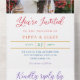 Photo all in one wedding invitation with elegant fonts in all the colours of the rainbow against a white background. You're invited is written at the top, beneath a photo of the happy couple, and above an informal wedding invitation.